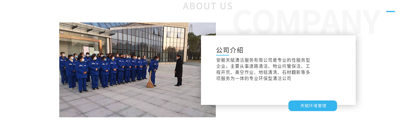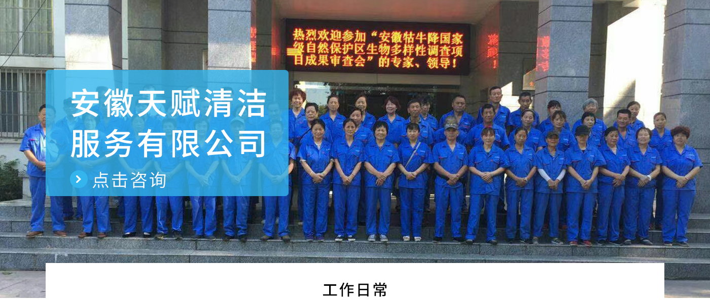 安徽天賦清潔服務(wù)有限公司是的服務(wù)型企業(yè),主要從事道路清潔、物業(yè)托管保潔、工程開(kāi)荒、高空作業(yè)、地毯清洗、石材翻新等多項(xiàng)服務(wù)為一體的環(huán)保型清潔公司。公司管理機(jī)制完善,清潔作業(yè)經(jīng)驗(yàn)豐富,擁有技術(shù)力量,嚴(yán)格實(shí)行崗前培訓(xùn)—崗中督查—上崗在培訓(xùn)的員工管理措施,憑著優(yōu)良的清潔質(zhì)量和嚴(yán)格的督查管理,為眾多企事業(yè)單位、醫(yī)院、酒店、廠(chǎng)區(qū)商場(chǎng)、物業(yè)、道路、學(xué)校、公園等提供后勤清潔服務(wù)。在業(yè)內(nèi)擁有良好的口碑。工作人員,服務(wù)態(tài)度優(yōu),竭力為客戶(hù)提供好的保潔服務(wù)。安徽天賦清潔服務(wù)有限公司:致力于長(zhǎng)期合作關(guān)系,提高服務(wù)質(zhì)量,提供高標(biāo)準(zhǔn)的清潔服務(wù)。公司的經(jīng)營(yíng)理念:為營(yíng)造一個(gè)更清潔、亮麗的生活和工作環(huán)境而努力!“誠(chéng)信”是公司成功保證?!翱蛻?hù)至上,信譽(yù)為首”是公司宗旨。高標(biāo)準(zhǔn)提供服務(wù),維護(hù)客戶(hù)利益、形象,是我始終不渝的目標(biāo)。